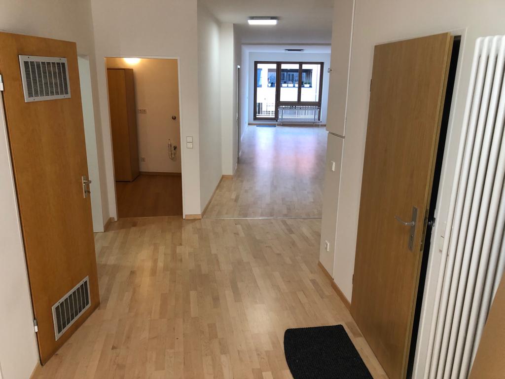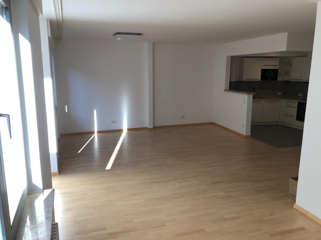 Der vordere Wohnteil mit integrierter Küche ist sehr hell und geräumig in beide Dimensionen. Es gewährt einen Blick auf die Flaniermeile der Innenstadt und ist - wie die ganze Wohnung - mit elektrischen Rollläden ausgestattet.